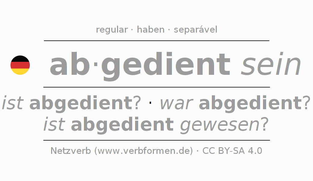 A conjugação do verbo abdienen (serviço militar) é regular. As formas mais comuns são ist abgedient?, war abgedient? e ist abgedient gewesen?. O verbo auxilar para abdienen é "haben".