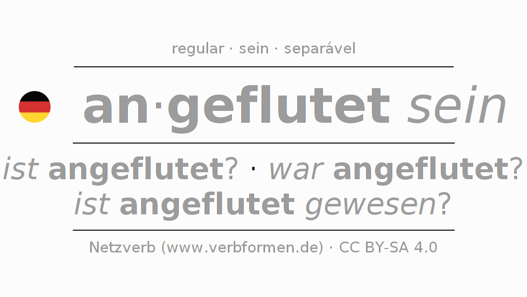 A conjugação do verbo an·geflutet sein é apresentada online assim como a Tabela de Verbo com todas as formas verbais no singular e no plural, e em todas as pessoas (1ª pessoa, 2ª pessoa, 3ª pessoa) A flexão do verbo an·geflutet sein é portanto, uma ajuda para os trabalhos de casa, testes, exames, aulas de alemão, para o estudo do alemão como língua estrangeira, como segunda língua e também na formação de adultos. Especialmente no aprendizado do alemão é importante a conjugação correta do verbo com as respectivamente formas flexionadas corretamente (ist angeflutet? - war angeflutet? - ist angeflutet gewesen?). Mais informações podem ser encontradas no Wiktionary anfluten e no Duden anfluten.