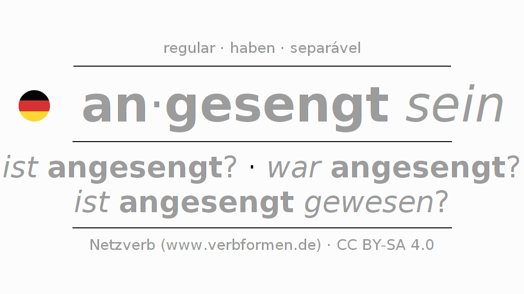 A conjugação do verbo an·gesengt sein é apresentada online assim como a Tabela de Verbo com todas as formas verbais no singular e no plural, e em todas as pessoas (1ª pessoa, 2ª pessoa, 3ª pessoa) A flexão do verbo an·gesengt sein é portanto, uma ajuda para os trabalhos de casa, testes, exames, aulas de alemão, para o estudo do alemão como língua estrangeira, como segunda língua e também na formação de adultos. Especialmente no aprendizado do alemão é importante a conjugação correta do verbo com as respectivamente formas flexionadas corretamente (ist angesengt? - war angesengt? - ist angesengt gewesen?). Mais informações podem ser encontradas no Wiktionary ansengen e no Duden ansengen.