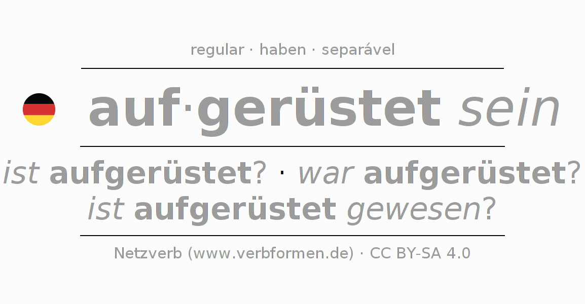 A conjugação do verbo auf·gerüstet sein é apresentada online assim como a Tabela de Verbo com todas as formas verbais no singular e no plural, e em todas as pessoas (1ª pessoa, 2ª pessoa, 3ª pessoa) A flexão do verbo auf·gerüstet sein é portanto, uma ajuda para os trabalhos de casa, testes, exames, aulas de alemão, para o estudo do alemão como língua estrangeira, como segunda língua e também na formação de adultos. Especialmente no aprendizado do alemão é importante a conjugação correta do verbo com as respectivamente formas flexionadas corretamente (ist aufgerüstet? - war aufgerüstet? - ist aufgerüstet gewesen?). Mais informações podem ser encontradas no Wiktionary aufrüsten e no Duden aufrüsten.