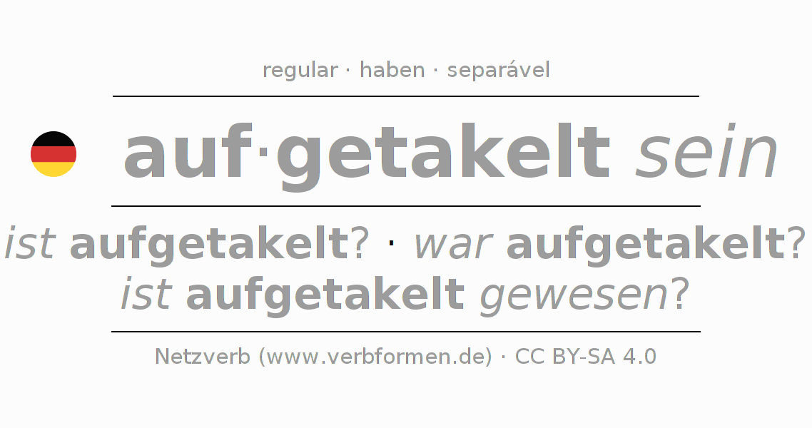 A conjugação do verbo auf·getakelt sein é apresentada online assim como a Tabela de Verbo com todas as formas verbais no singular e no plural, e em todas as pessoas (1ª pessoa, 2ª pessoa, 3ª pessoa) A flexão do verbo auf·getakelt sein é portanto, uma ajuda para os trabalhos de casa, testes, exames, aulas de alemão, para o estudo do alemão como língua estrangeira, como segunda língua e também na formação de adultos. Especialmente no aprendizado do alemão é importante a conjugação correta do verbo com as respectivamente formas flexionadas corretamente (ist aufgetakelt? - war aufgetakelt? - ist aufgetakelt gewesen?). Mais informações podem ser encontradas no Wiktionary auftakeln e no Duden auftakeln.