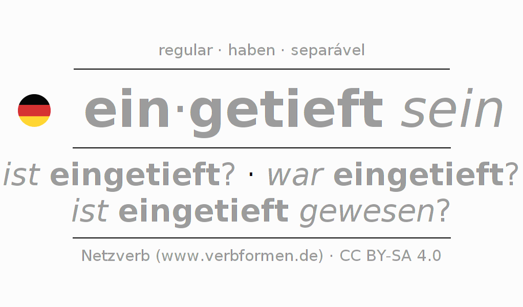 O prefixo ein - de eintiefen é separável. A flexão ocorre em Estado passivo e é usada como Oração interrogativa. Para melhor compreensão estão disponíveis incontáveis. Exemplos do verbo eintiefen . Para a prática e consolidação do estudo