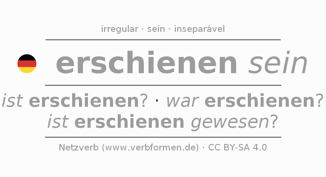 O prefixo er- de erscheinen é inseparável. A flexão ocorre em Estado passivo e é usada como Oração interrogativa. Para melhor compreensão estão disponíveis incontáveis. Exemplos do verbo erscheinen . Para a prática e consolidação do estudo