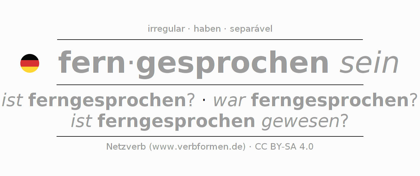 A conjugação do verbo fern·gesprochen sein é apresentada online assim como a Tabela de Verbo com todas as formas verbais no singular e no plural, e em todas as pessoas (1ª pessoa, 2ª pessoa, 3ª pessoa) A flexão do verbo fern·gesprochen sein é portanto, uma ajuda para os trabalhos de casa, testes, exames, aulas de alemão, para o estudo do alemão como língua estrangeira, como segunda língua e também na formação de adultos. Especialmente no aprendizado do alemão é importante a conjugação correta do verbo com as respectivamente formas flexionadas corretamente (ist ferngesprochen? - war ferngesprochen? - ist ferngesprochen gewesen?). Mais informações podem ser encontradas no Wiktionary fernsprechen e no Duden fernsprechen.