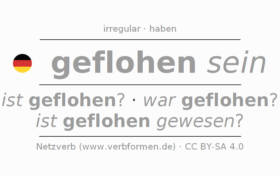 A conjugação do verbo geflohen sein é apresentada online assim como a Tabela de Verbo com todas as formas verbais no singular e no plural, e em todas as pessoas (1ª pessoa, 2ª pessoa, 3ª pessoa) A flexão do verbo geflohen sein é portanto, uma ajuda para os trabalhos de casa, testes, exames, aulas de alemão, para o estudo do alemão como língua estrangeira, como segunda língua e também na formação de adultos. Especialmente no aprendizado do alemão é importante a conjugação correta do verbo com as respectivamente formas flexionadas corretamente (ist geflohen? - war geflohen? - ist geflohen gewesen?). Mais informações podem ser encontradas no Wiktionary fliehen e no Duden fliehen.