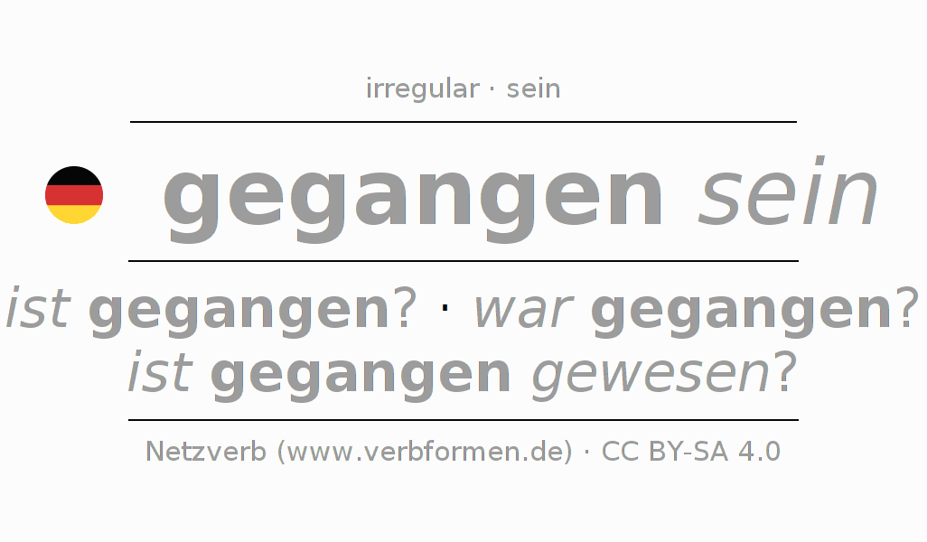 A conjugação do verbo gegangen sein é apresentada online assim como a Tabela de Verbo com todas as formas verbais no singular e no plural, e em todas as pessoas (1ª pessoa, 2ª pessoa, 3ª pessoa) A flexão do verbo gegangen sein é portanto, uma ajuda para os trabalhos de casa, testes, exames, aulas de alemão, para o estudo do alemão como língua estrangeira, como segunda língua e também na formação de adultos. Especialmente no aprendizado do alemão é importante a conjugação correta do verbo com as respectivamente formas flexionadas corretamente (ist gegangen? - war gegangen? - ist gegangen gewesen?). Mais informações podem ser encontradas no Wiktionary gehen e no Duden gehen.