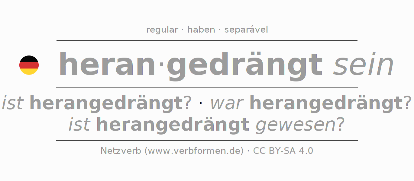 A conjugação do verbo heran·gedrängt sein é apresentada online assim como a Tabela de Verbo com todas as formas verbais no singular e no plural, e em todas as pessoas (1ª pessoa, 2ª pessoa, 3ª pessoa) A flexão do verbo heran·gedrängt sein é portanto, uma ajuda para os trabalhos de casa, testes, exames, aulas de alemão, para o estudo do alemão como língua estrangeira, como segunda língua e também na formação de adultos. Especialmente no aprendizado do alemão é importante a conjugação correta do verbo com as respectivamente formas flexionadas corretamente (ist herangedrängt? - war herangedrängt? - ist herangedrängt gewesen?). Mais informações podem ser encontradas no Wiktionary herandrängen e no Duden herandrängen.