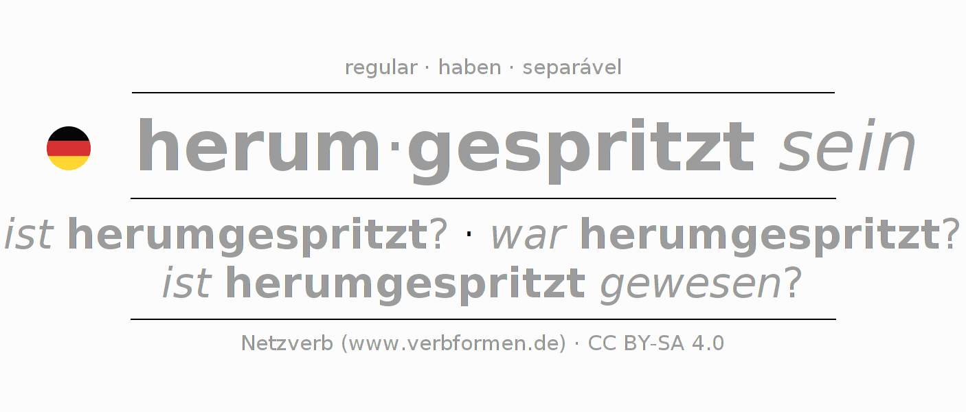 O prefixo herum - de herumspritzen é separável. A flexão ocorre em Estado passivo e é usada como Oração interrogativa. Para melhor compreensão estão disponíveis incontáveis. Exemplos do verbo herumspritzen . Para a prática e consolidação do estudo