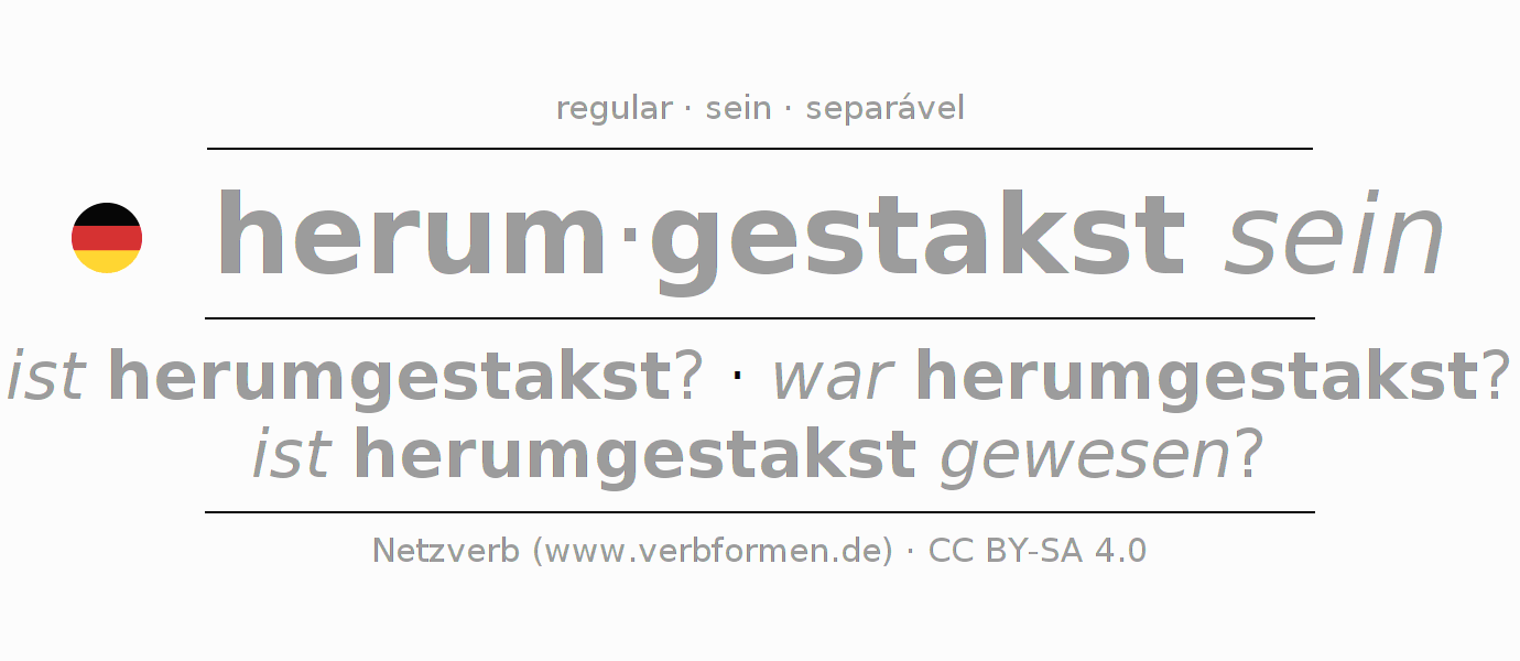 A conjugação do verbo herum·gestakst sein é apresentada online assim como a Tabela de Verbo com todas as formas verbais no singular e no plural, e em todas as pessoas (1ª pessoa, 2ª pessoa, 3ª pessoa) A flexão do verbo herum·gestakst sein é portanto, uma ajuda para os trabalhos de casa, testes, exames, aulas de alemão, para o estudo do alemão como língua estrangeira, como segunda língua e também na formação de adultos. Especialmente no aprendizado do alemão é importante a conjugação correta do verbo com as respectivamente formas flexionadas corretamente (ist herumgestakst? - war herumgestakst? - ist herumgestakst gewesen?). Mais informações podem ser encontradas no Wiktionary herumstaksen e no Duden herumstaksen.