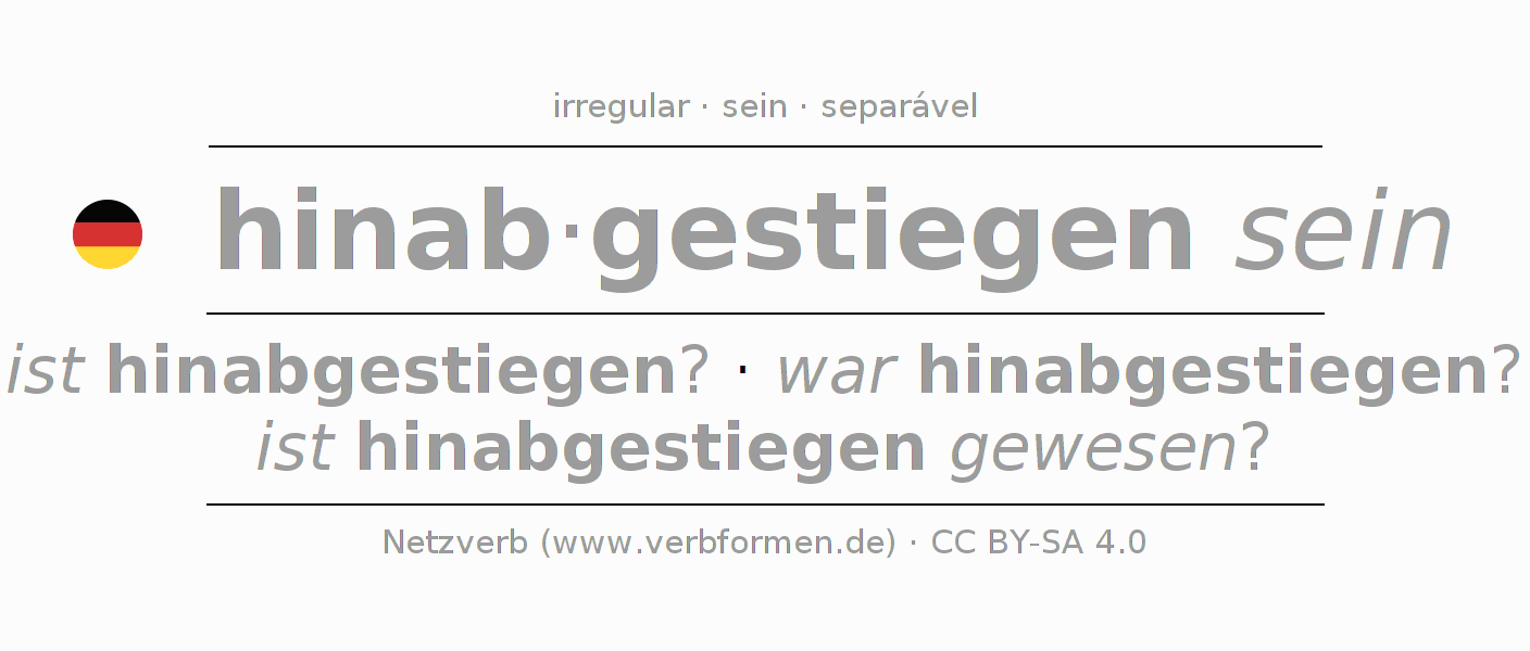 A conjugação do verbo hinabsteigen (descer, descer de) é irregular. As formas mais comuns são ist hinabgestiegen?, war hinabgestiegen? e ist hinabgestiegen gewesen?. A apofonia é feita com a vogal do radical ei
