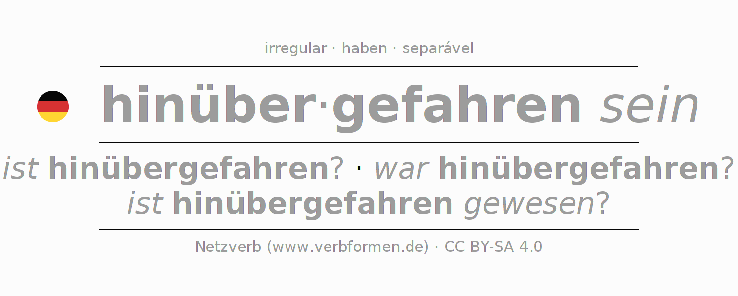 A conjugação do verbo hinüberfahren (atravessar, passar) é irregular. As formas mais comuns são ist hinübergefahren?, war hinübergefahren? e ist hinübergefahren gewesen?. A apofonia é feita com a vogal do radical a