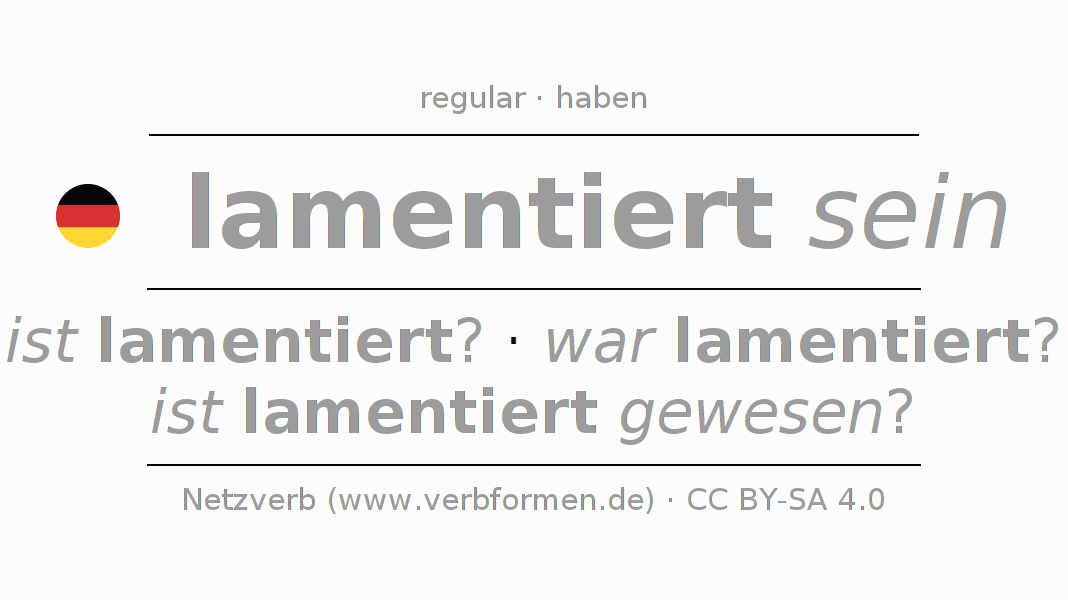 A conjugação do verbo lamentieren (queixar-se, lamentar) é regular. As formas mais comuns são ist lamentiert?, war lamentiert? e ist lamentiert gewesen?. O verbo auxilar para lamentieren é "haben".