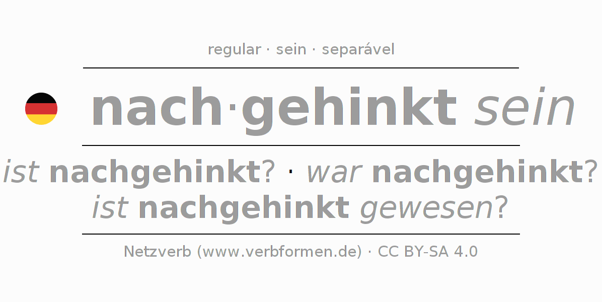 A conjugação do verbo nach·gehinkt sein é apresentada online assim como a Tabela de Verbo com todas as formas verbais no singular e no plural, e em todas as pessoas (1ª pessoa, 2ª pessoa, 3ª pessoa) A flexão do verbo nach·gehinkt sein é portanto, uma ajuda para os trabalhos de casa, testes, exames, aulas de alemão, para o estudo do alemão como língua estrangeira, como segunda língua e também na formação de adultos. Especialmente no aprendizado do alemão é importante a conjugação correta do verbo com as respectivamente formas flexionadas corretamente (ist nachgehinkt? - war nachgehinkt? - ist nachgehinkt gewesen?). Mais informações podem ser encontradas no Wiktionary nachhinken e no Duden nachhinken.