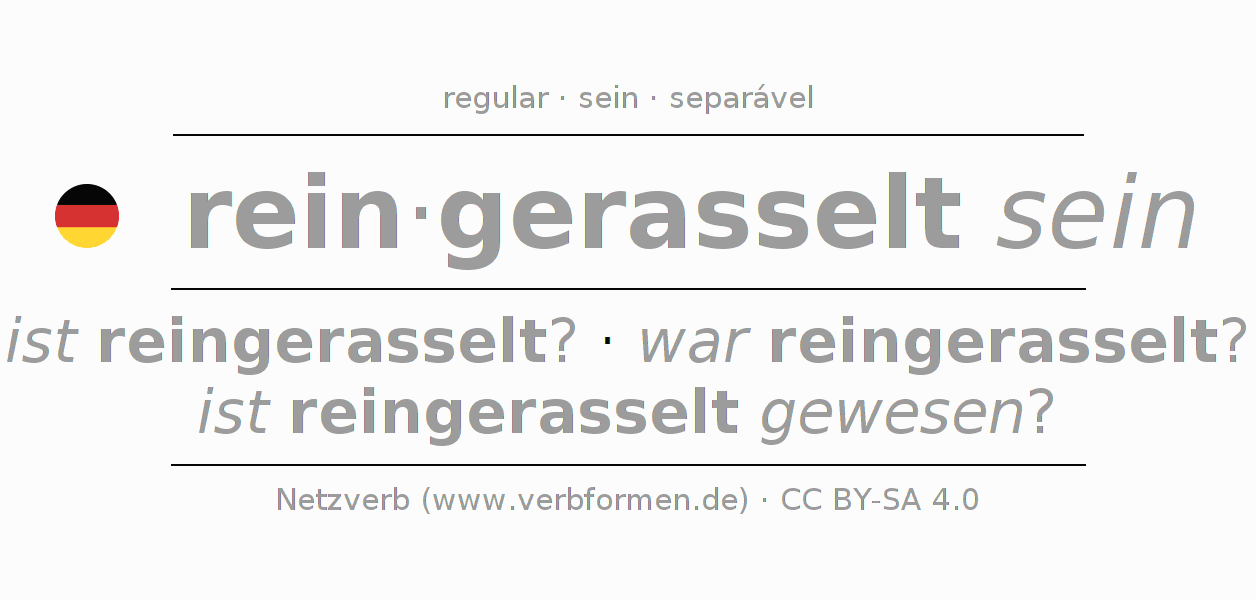 A conjugação do verbo rein·gerasselt sein é apresentada online assim como a Tabela de Verbo com todas as formas verbais no singular e no plural, e em todas as pessoas (1ª pessoa, 2ª pessoa, 3ª pessoa) A flexão do verbo rein·gerasselt sein é portanto, uma ajuda para os trabalhos de casa, testes, exames, aulas de alemão, para o estudo do alemão como língua estrangeira, como segunda língua e também na formação de adultos. Especialmente no aprendizado do alemão é importante a conjugação correta do verbo com as respectivamente formas flexionadas corretamente (ist reingerasselt? - war reingerasselt? - ist reingerasselt gewesen?). Mais informações podem ser encontradas no Wiktionary reinrasseln e no Duden reinrasseln.