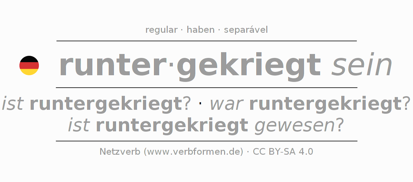 A conjugação do verbo runterkriegen (conseguir, baixar) é regular. As formas mais comuns são ist runtergekriegt?, war runtergekriegt? e ist runtergekriegt gewesen?. O verbo auxilar para runterkriegen é "haben".