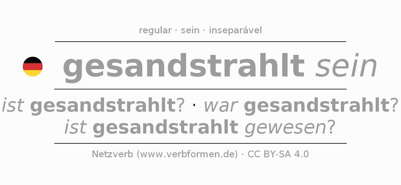 A conjugação do verbo gesandstrahlt sein é apresentada online assim como a Tabela de Verbo com todas as formas verbais no singular e no plural, e em todas as pessoas (1ª pessoa, 2ª pessoa, 3ª pessoa) A flexão do verbo gesandstrahlt sein é portanto, uma ajuda para os trabalhos de casa, testes, exames, aulas de alemão, para o estudo do alemão como língua estrangeira, como segunda língua e também na formação de adultos. Especialmente no aprendizado do alemão é importante a conjugação correta do verbo com as respectivamente formas flexionadas corretamente (ist gesandstrahlt? - war gesandstrahlt? - ist gesandstrahlt gewesen?). Mais informações podem ser encontradas no Wiktionary sandstrahlen e no Duden sandstrahlen.