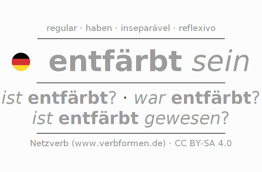 sich entfärben é um verbo reflexivo. Pode ser usado também como não reflexivo. O prefixo ent- de sich entfärben é inseparável. A flexão ocorre em Estado passivo e é usada como Oração interrogativa. Para melhor compreensão estão disponíveis incontáveis. Exemplos do verbo entfärben . Para a prática e consolidação do estudo