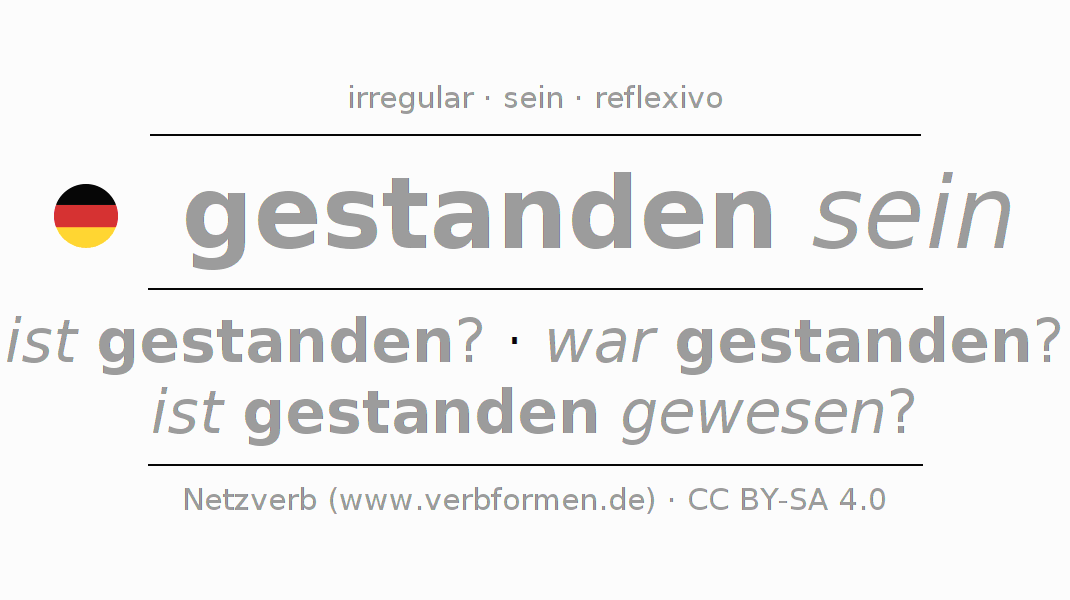 A conjugação do verbo gestanden sein é apresentada online assim como a Tabela de Verbo com todas as formas verbais no singular e no plural, e em todas as pessoas (1ª pessoa, 2ª pessoa, 3ª pessoa) A flexão do verbo gestanden sein é portanto, uma ajuda para os trabalhos de casa, testes, exames, aulas de alemão, para o estudo do alemão como língua estrangeira, como segunda língua e também na formação de adultos. Especialmente no aprendizado do alemão é importante a conjugação correta do verbo com as respectivamente formas flexionadas corretamente (ist gestanden? - war gestanden? - ist gestanden gewesen?). Mais informações podem ser encontradas no Wiktionary stehen e no Duden stehen.