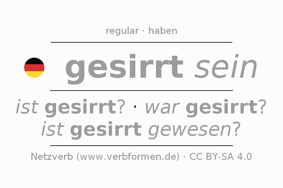 - Perfeito: bin ich gesirrt gewesen?, bist du gesirrt gewesen?, ist er gesirrt gewesen?, sind wir gesirrt gewesen?, seid ihr gesirrt gewesen?, sind sie gesirrt gewesen?