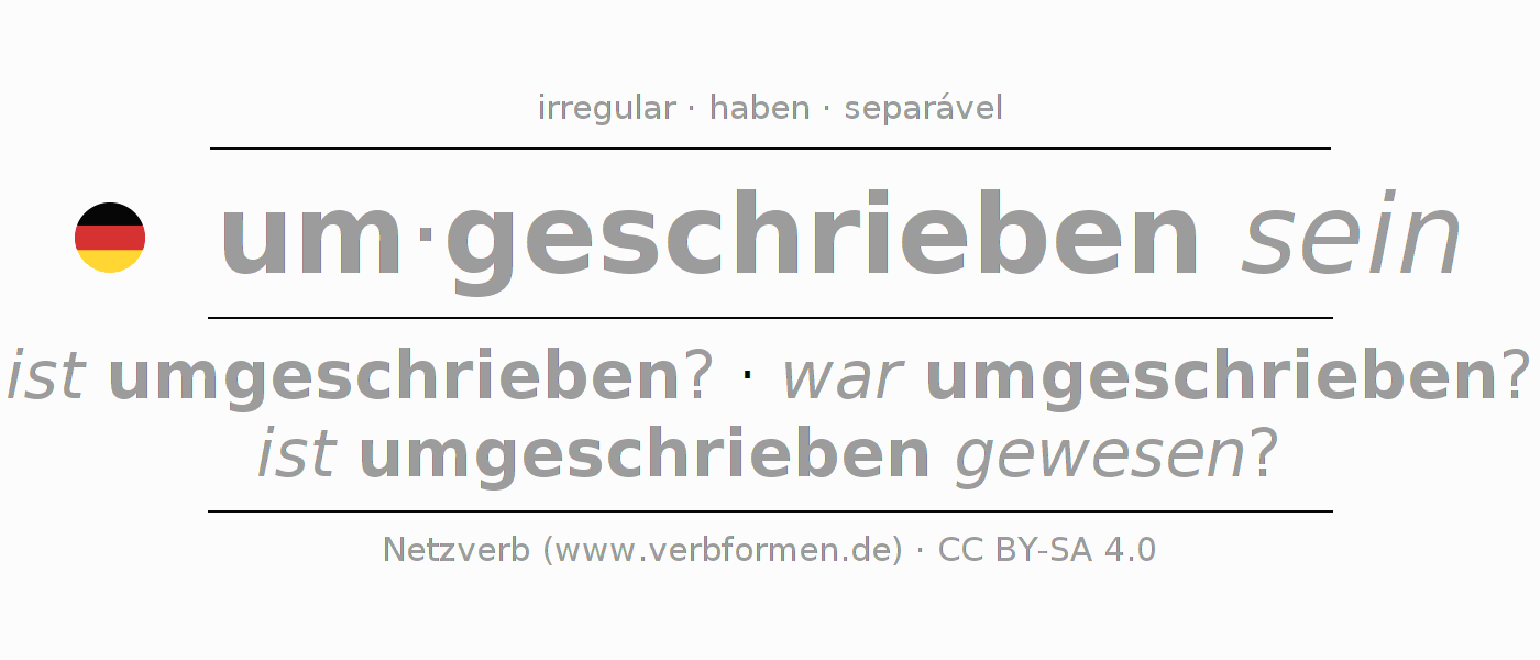 A conjugação do verbo umschreiben (reescrever, transcrever) é irregular. As formas mais comuns são ist umgeschrieben?, war umgeschrieben? e ist umgeschrieben gewesen?. A apofonia é feita com a vogal do radical ei