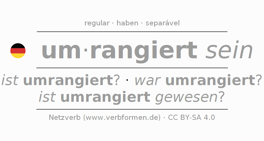 A conjugação do verbo um·rangiert sein é apresentada online assim como a Tabela de Verbo com todas as formas verbais no singular e no plural, e em todas as pessoas (1ª pessoa, 2ª pessoa, 3ª pessoa) A flexão do verbo um·rangiert sein é portanto, uma ajuda para os trabalhos de casa, testes, exames, aulas de alemão, para o estudo do alemão como língua estrangeira, como segunda língua e também na formação de adultos. Especialmente no aprendizado do alemão é importante a conjugação correta do verbo com as respectivamente formas flexionadas corretamente (ist umrangiert? - war umrangiert? - ist umrangiert gewesen?). Mais informações podem ser encontradas no Wiktionary umrangieren e no Duden umrangieren.
