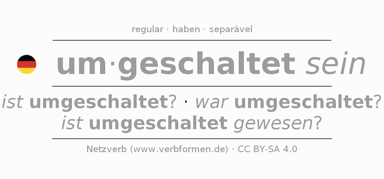 A conjugação do verbo umschalten (mudar, alternar) é regular. As formas mais comuns são ist umgeschaltet?, war umgeschaltet? e ist umgeschaltet gewesen?. O verbo auxilar para umschalten é "haben".
