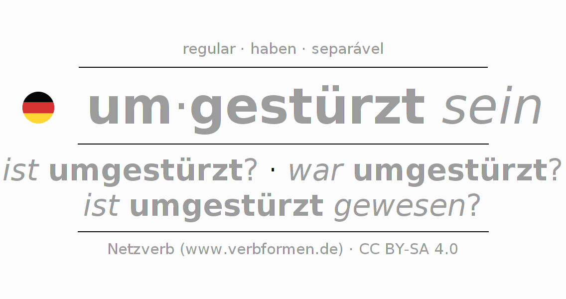 A conjugação do verbo um·gestürzt sein é apresentada online assim como a Tabela de Verbo com todas as formas verbais no singular e no plural, e em todas as pessoas (1ª pessoa, 2ª pessoa, 3ª pessoa) A flexão do verbo um·gestürzt sein é portanto, uma ajuda para os trabalhos de casa, testes, exames, aulas de alemão, para o estudo do alemão como língua estrangeira, como segunda língua e também na formação de adultos. Especialmente no aprendizado do alemão é importante a conjugação correta do verbo com as respectivamente formas flexionadas corretamente (ist umgestürzt? - war umgestürzt? - ist umgestürzt gewesen?). Mais informações podem ser encontradas no Wiktionary umstürzen e no Duden umstürzen.