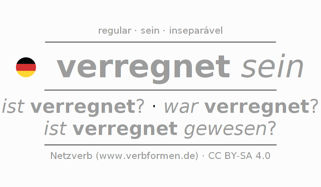 A conjugação do verbo verregnet sein é apresentada online assim como a Tabela de Verbo com todas as formas verbais no singular e no plural, e em todas as pessoas (1ª pessoa, 2ª pessoa, 3ª pessoa) A flexão do verbo verregnet sein é portanto, uma ajuda para os trabalhos de casa, testes, exames, aulas de alemão, para o estudo do alemão como língua estrangeira, como segunda língua e também na formação de adultos. Especialmente no aprendizado do alemão é importante a conjugação correta do verbo com as respectivamente formas flexionadas corretamente (ist verregnet? - war verregnet? - ist verregnet gewesen?). Mais informações podem ser encontradas no Wiktionary verregnen e no Duden verregnen.
