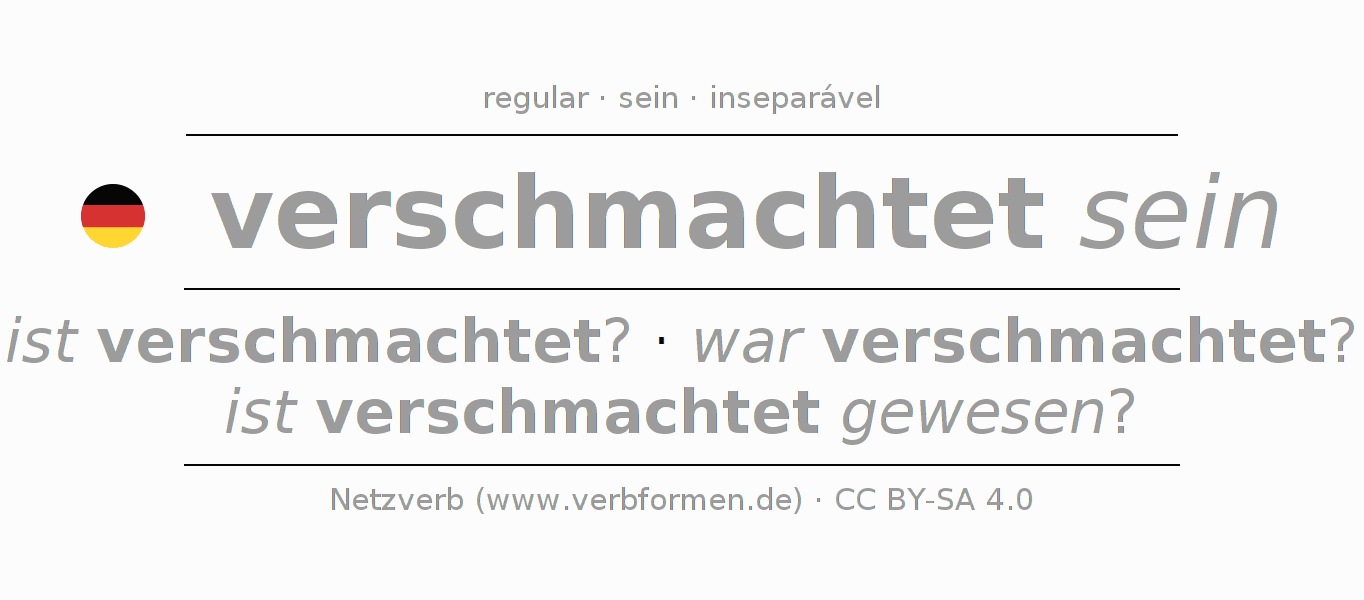 A conjugação do verbo verschmachtet sein é apresentada online assim como a Tabela de Verbo com todas as formas verbais no singular e no plural, e em todas as pessoas (1ª pessoa, 2ª pessoa, 3ª pessoa) A flexão do verbo verschmachtet sein é portanto, uma ajuda para os trabalhos de casa, testes, exames, aulas de alemão, para o estudo do alemão como língua estrangeira, como segunda língua e também na formação de adultos. Especialmente no aprendizado do alemão é importante a conjugação correta do verbo com as respectivamente formas flexionadas corretamente (ist verschmachtet? - war verschmachtet? - ist verschmachtet gewesen?). Mais informações podem ser encontradas no Wiktionary verschmachten e no Duden verschmachten.