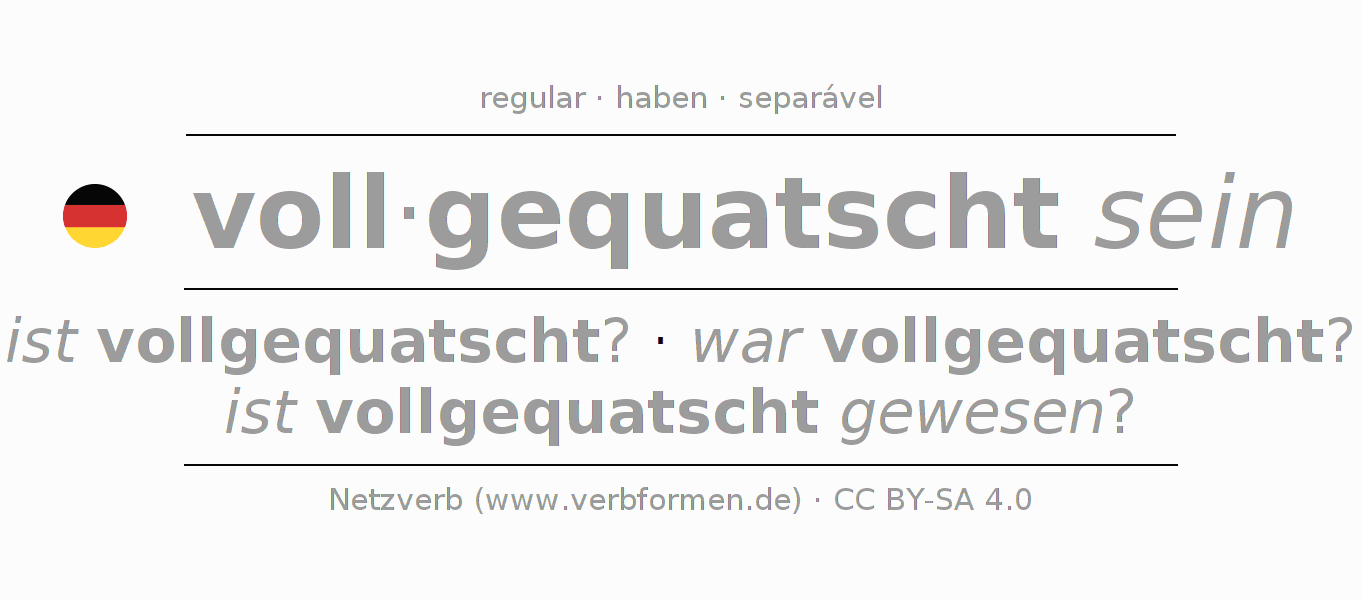 A conjugação do verbo voll·gequatscht sein é apresentada online assim como a Tabela de Verbo com todas as formas verbais no singular e no plural, e em todas as pessoas (1ª pessoa, 2ª pessoa, 3ª pessoa) A flexão do verbo voll·gequatscht sein é portanto, uma ajuda para os trabalhos de casa, testes, exames, aulas de alemão, para o estudo do alemão como língua estrangeira, como segunda língua e também na formação de adultos. Especialmente no aprendizado do alemão é importante a conjugação correta do verbo com as respectivamente formas flexionadas corretamente (ist vollgequatscht? - war vollgequatscht? - ist vollgequatscht gewesen?). Mais informações podem ser encontradas no Wiktionary vollquatschen e no Duden vollquatschen.