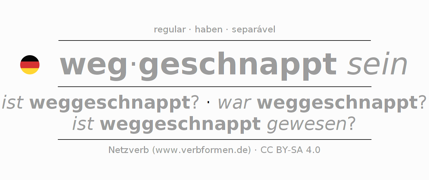 A conjugação do verbo weg·geschnappt sein é apresentada online assim como a Tabela de Verbo com todas as formas verbais no singular e no plural, e em todas as pessoas (1ª pessoa, 2ª pessoa, 3ª pessoa) A flexão do verbo weg·geschnappt sein é portanto, uma ajuda para os trabalhos de casa, testes, exames, aulas de alemão, para o estudo do alemão como língua estrangeira, como segunda língua e também na formação de adultos. Especialmente no aprendizado do alemão é importante a conjugação correta do verbo com as respectivamente formas flexionadas corretamente (ist weggeschnappt? - war weggeschnappt? - ist weggeschnappt gewesen?). Mais informações podem ser encontradas no Wiktionary wegschnappen e no Duden wegschnappen.