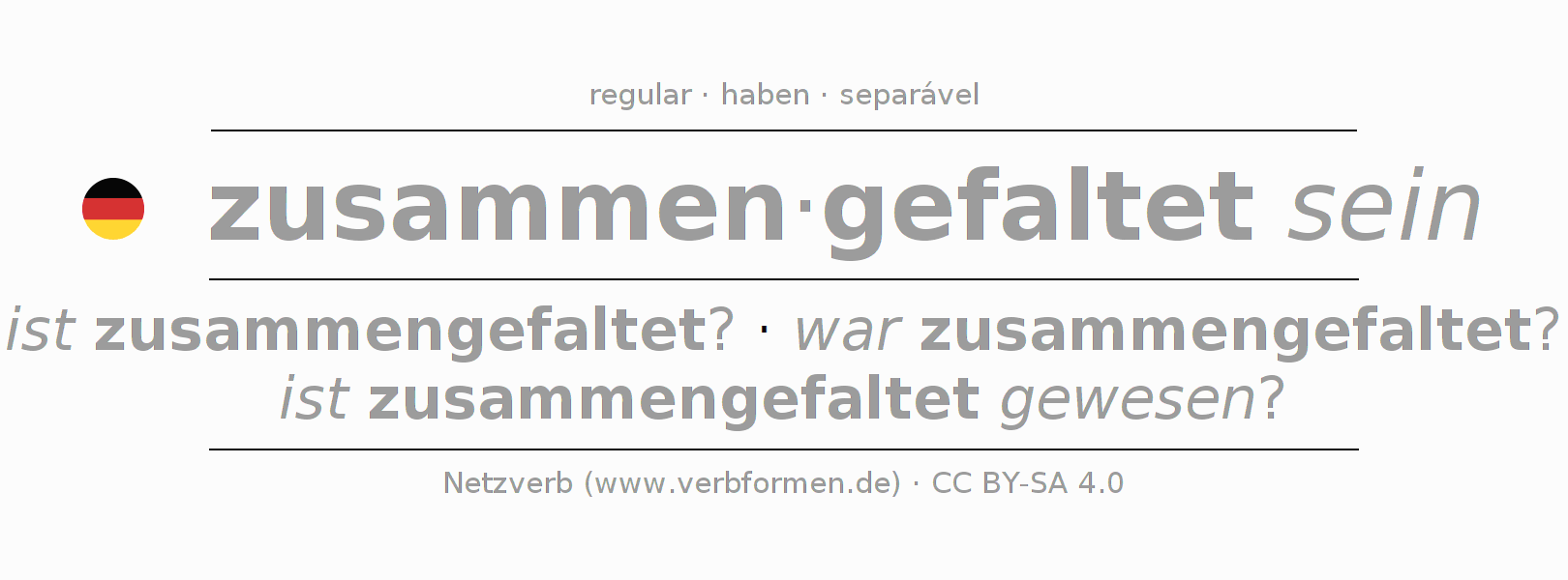 A conjugação do verbo zusammen·gefaltet sein é apresentada online assim como a Tabela de Verbo com todas as formas verbais no singular e no plural, e em todas as pessoas (1ª pessoa, 2ª pessoa, 3ª pessoa) A flexão do verbo zusammen·gefaltet sein é portanto, uma ajuda para os trabalhos de casa, testes, exames, aulas de alemão, para o estudo do alemão como língua estrangeira, como segunda língua e também na formação de adultos. Especialmente no aprendizado do alemão é importante a conjugação correta do verbo com as respectivamente formas flexionadas corretamente (ist zusammengefaltet? - war zusammengefaltet? - ist zusammengefaltet gewesen?). Mais informações podem ser encontradas no Wiktionary zusammenfalten e no Duden zusammenfalten.
