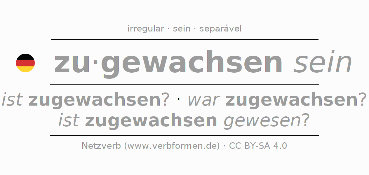 A conjugação do verbo zu·gewachsen sein é apresentada online assim como a Tabela de Verbo com todas as formas verbais no singular e no plural, e em todas as pessoas (1ª pessoa, 2ª pessoa, 3ª pessoa) A flexão do verbo zu·gewachsen sein é portanto, uma ajuda para os trabalhos de casa, testes, exames, aulas de alemão, para o estudo do alemão como língua estrangeira, como segunda língua e também na formação de adultos. Especialmente no aprendizado do alemão é importante a conjugação correta do verbo com as respectivamente formas flexionadas corretamente (ist zugewachsen? - war zugewachsen? - ist zugewachsen gewesen?). Mais informações podem ser encontradas no Wiktionary zuwachsen e no Duden zuwachsen.