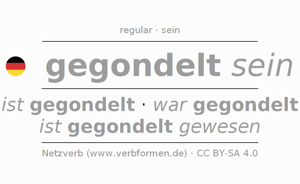 A conjugação do verbo gegondelt sein é apresentada online assim como a Tabela de Verbo com todas as formas verbais no singular e no plural, e em todas as pessoas (1ª pessoa, 2ª pessoa, 3ª pessoa) A flexão do verbo gegondelt sein é portanto, uma ajuda para os trabalhos de casa, testes, exames, aulas de alemão, para o estudo do alemão como língua estrangeira, como segunda língua e também na formação de adultos. Especialmente no aprendizado do alemão é importante a conjugação correta do verbo com as respectivamente formas flexionadas corretamente (ist gegondelt - war gegondelt - ist gegondelt gewesen). Mais informações podem ser encontradas no Wiktionary gondeln e no Duden gondeln.