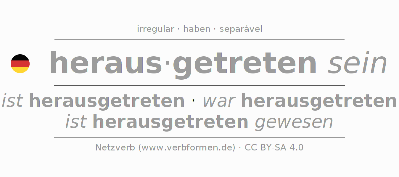A conjugação do verbo heraustreten (aparecer, sair) é irregular. As formas mais comuns são ist herausgetreten, war herausgetreten e ist herausgetreten gewesen. A apofonia é feita com a vogal do radical e