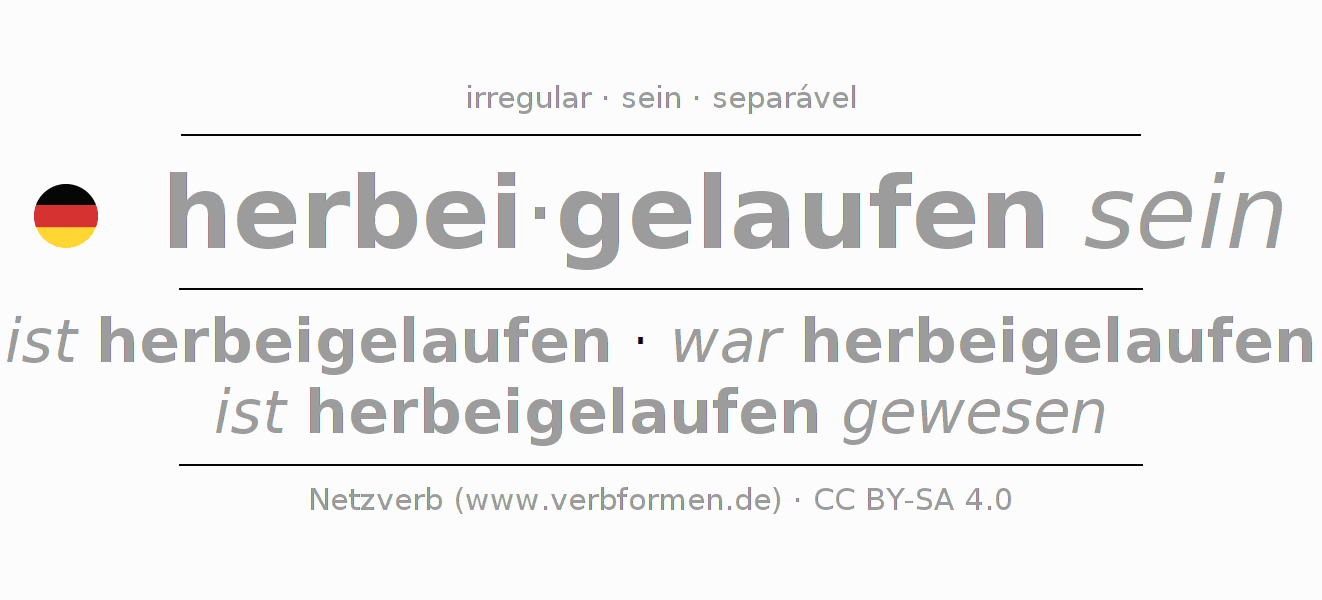 - Perfeito: ich bin herbeigelaufen gewesen, du bist herbeigelaufen gewesen, er ist herbeigelaufen gewesen, wir sind herbeigelaufen gewesen, ihr seid herbeigelaufen gewesen, sie sind herbeigelaufen gewesen