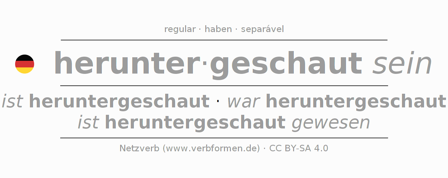 A conjugação do verbo herunterschauen (olhar para baixo) é regular. As formas mais comuns são ist heruntergeschaut, war heruntergeschaut e ist heruntergeschaut gewesen. O verbo auxilar para herunterschauen é "haben".