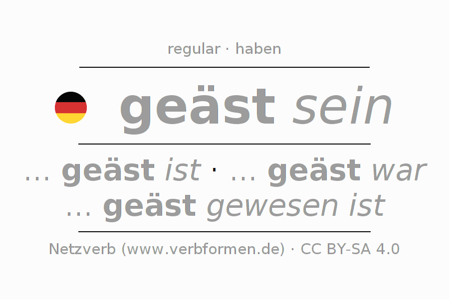 A conjugação do verbo geäst sein é apresentada online assim como a Tabela de Verbo com todas as formas verbais no singular e no plural, e em todas as pessoas (1ª pessoa, 2ª pessoa, 3ª pessoa) A flexão do verbo geäst sein é portanto, uma ajuda para os trabalhos de casa, testes, exames, aulas de alemão, para o estudo do alemão como língua estrangeira, como segunda língua e também na formação de adultos. Especialmente no aprendizado do alemão é importante a conjugação correta do verbo com as respectivamente formas flexionadas corretamente (... geäst ist - ... geäst war - ... geäst gewesen ist). Mais informações podem ser encontradas no Wiktionary äsen e no Duden äsen.