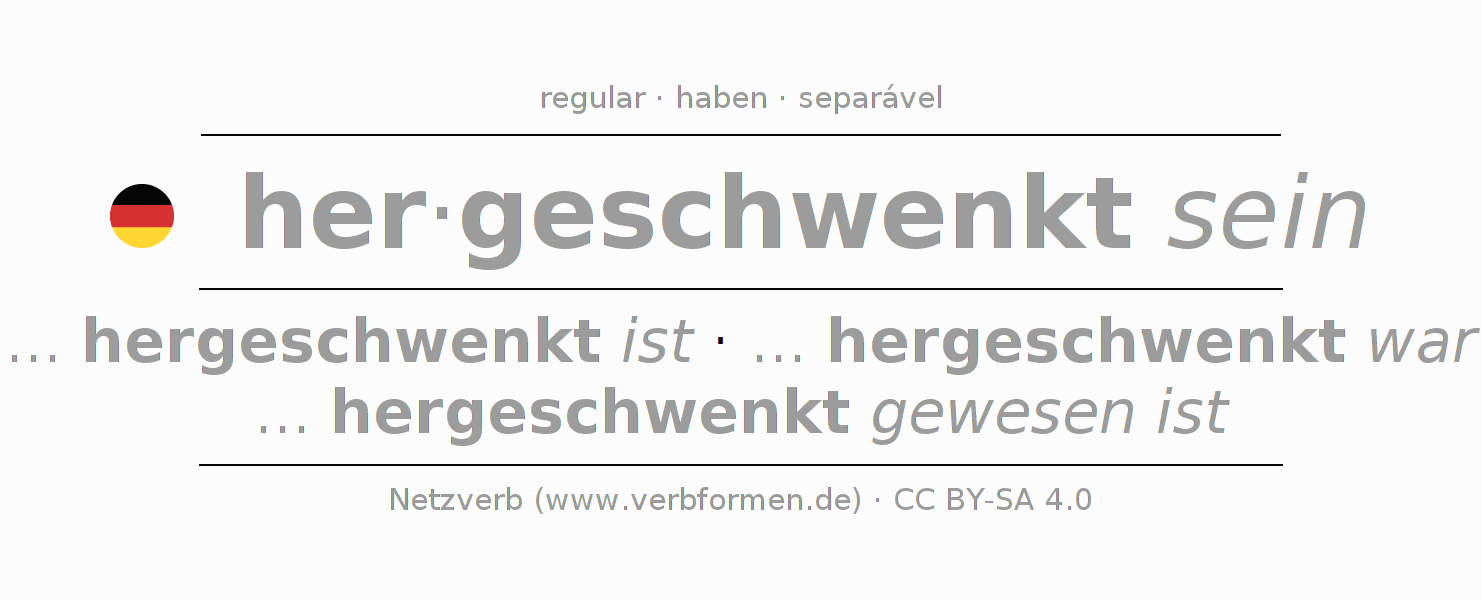 O prefixo her - de herschwenken é separável. A flexão ocorre em Estado passivo e é usada como Oração subordinada. Para melhor compreensão estão disponíveis incontáveis. Exemplos do verbo herschwenken . Para a prática e consolidação do estudo