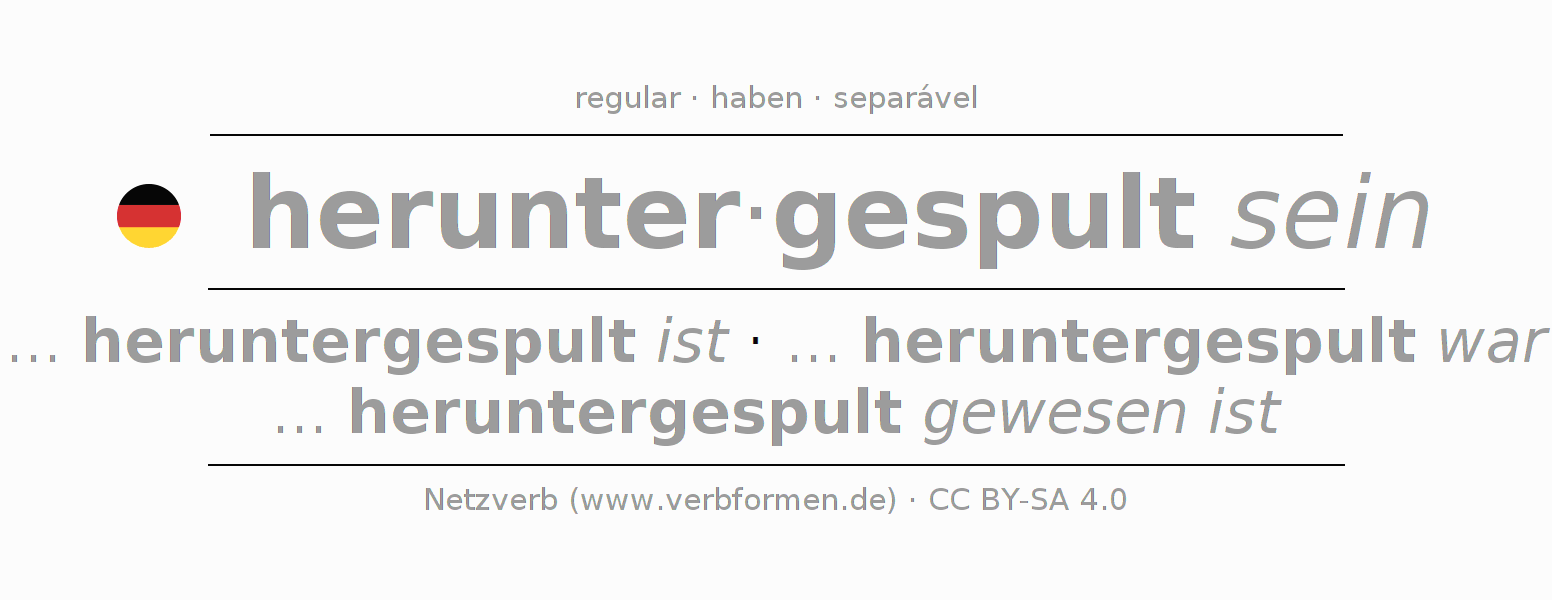 A conjugação do verbo herunterspulen (dizer de cor, recitar de memória) é regular. As formas mais comuns são ... heruntergespult ist, ... heruntergespult war e ... heruntergespult gewesen ist. O verbo auxilar para herunterspulen é "haben".