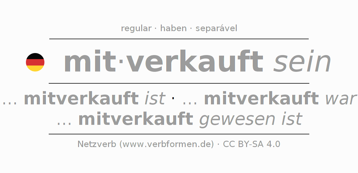 A conjugação do verbo mitverkaufen (vender junto) é regular. As formas mais comuns são ... mitverkauft ist, ... mitverkauft war e ... mitverkauft gewesen ist. O verbo auxilar para mitverkaufen é "haben".