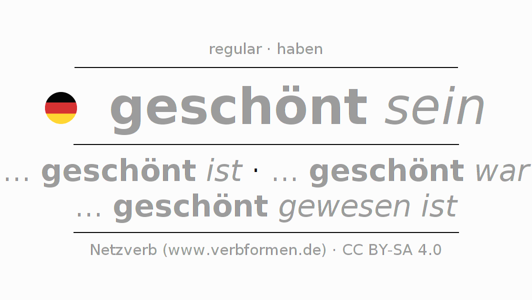 A conjugação do verbo geschönt sein é apresentada online assim como a Tabela de Verbo com todas as formas verbais no singular e no plural, e em todas as pessoas (1ª pessoa, 2ª pessoa, 3ª pessoa) A flexão do verbo geschönt sein é portanto, uma ajuda para os trabalhos de casa, testes, exames, aulas de alemão, para o estudo do alemão como língua estrangeira, como segunda língua e também na formação de adultos. Especialmente no aprendizado do alemão é importante a conjugação correta do verbo com as respectivamente formas flexionadas corretamente (... geschönt ist - ... geschönt war - ... geschönt gewesen ist). Mais informações podem ser encontradas no Wiktionary schönen e no Duden schönen.