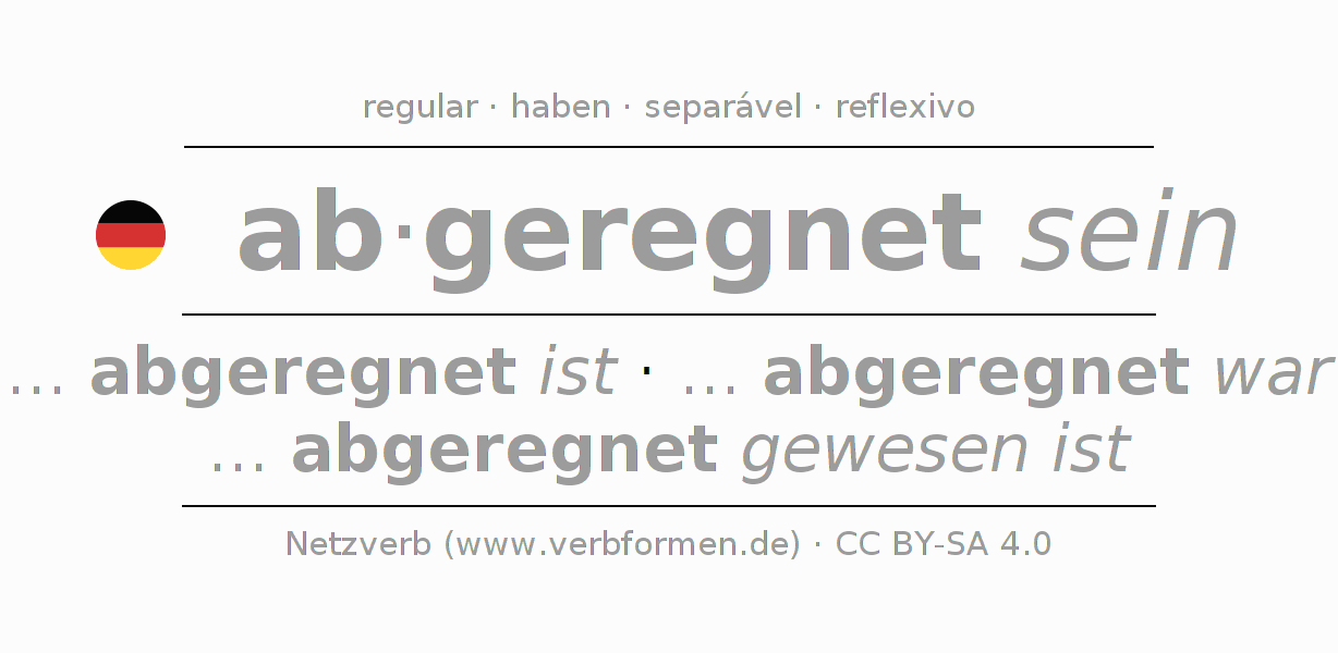 A conjugação do verbo sich abregnen (chuva) é regular. As formas mais comuns são ... abgeregnet ist, ... abgeregnet war e ... abgeregnet gewesen ist. O verbo auxilar para sich abregnen é "haben".