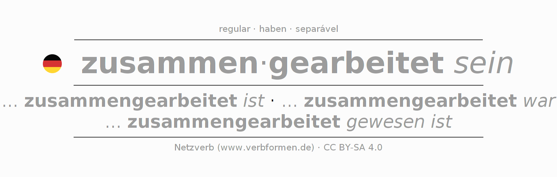 A conjugação do verbo zusammenarbeiten (colaborar, cooperar com) é regular. As formas mais comuns são ... zusammengearbeitet ist, ... zusammengearbeitet war e ... zusammengearbeitet gewesen ist. O verbo auxilar para zusammenarbeiten é "haben".