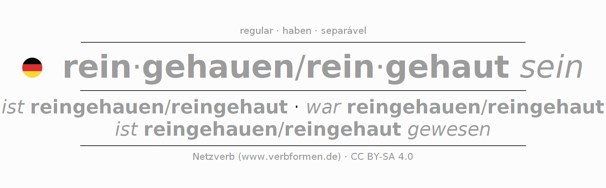 - Perfeito: ich bin reingehau(e)n/reingehaut gewesen, du bist reingehau(e)n/reingehaut gewesen, er ist reingehau(e)n/reingehaut gewesen, wir sind reingehau(e)n/reingehaut gewesen, ihr seid reingehau(e)n/reingehaut gewesen, sie sind reingehau(e)n/reingehaut gewesen