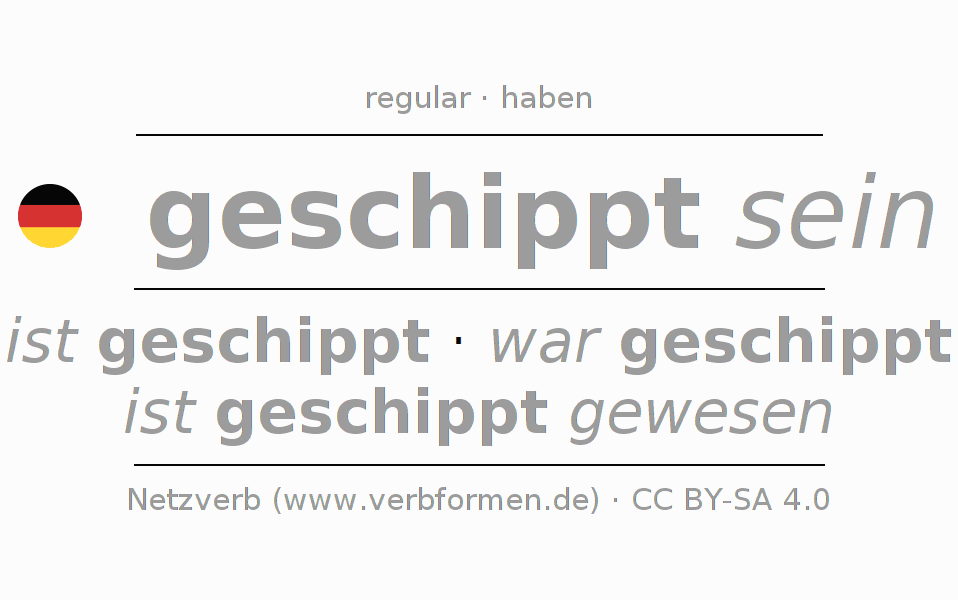 A conjugação do verbo geschippt sein é apresentada online assim como a Tabela de Verbo com todas as formas verbais no singular e no plural, e em todas as pessoas (1ª pessoa, 2ª pessoa, 3ª pessoa) A flexão do verbo geschippt sein é portanto, uma ajuda para os trabalhos de casa, testes, exames, aulas de alemão, para o estudo do alemão como língua estrangeira, como segunda língua e também na formação de adultos. Especialmente no aprendizado do alemão é importante a conjugação correta do verbo com as respectivamente formas flexionadas corretamente (ist geschippt - war geschippt - ist geschippt gewesen). Mais informações podem ser encontradas no Wiktionary schippen e no Duden schippen.