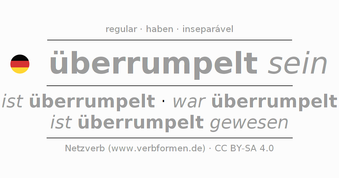A conjugação do verbo überrumpelt sein é apresentada online assim como a Tabela de Verbo com todas as formas verbais no singular e no plural, e em todas as pessoas (1ª pessoa, 2ª pessoa, 3ª pessoa) A flexão do verbo überrumpelt sein é portanto, uma ajuda para os trabalhos de casa, testes, exames, aulas de alemão, para o estudo do alemão como língua estrangeira, como segunda língua e também na formação de adultos. Especialmente no aprendizado do alemão é importante a conjugação correta do verbo com as respectivamente formas flexionadas corretamente (ist überrumpelt - war überrumpelt - ist überrumpelt gewesen). Mais informações podem ser encontradas no Wiktionary überrumpeln e no Duden überrumpeln.