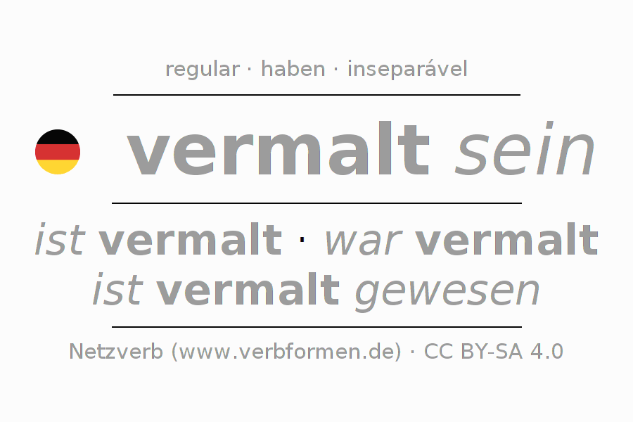 A conjugação do verbo vermalt sein é apresentada online assim como a Tabela de Verbo com todas as formas verbais no singular e no plural, e em todas as pessoas (1ª pessoa, 2ª pessoa, 3ª pessoa) A flexão do verbo vermalt sein é portanto, uma ajuda para os trabalhos de casa, testes, exames, aulas de alemão, para o estudo do alemão como língua estrangeira, como segunda língua e também na formação de adultos. Especialmente no aprendizado do alemão é importante a conjugação correta do verbo com as respectivamente formas flexionadas corretamente (ist vermalt - war vermalt - ist vermalt gewesen). Mais informações podem ser encontradas no Wiktionary vermalen e no Duden vermalen.