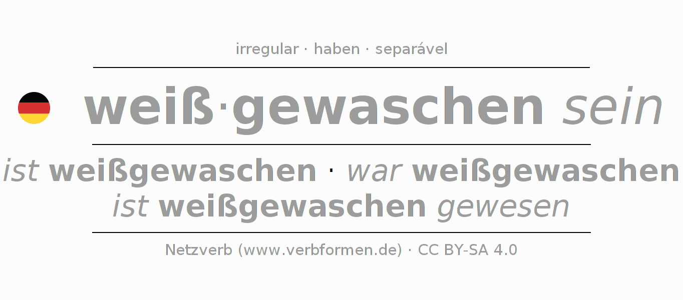 A conjugação do verbo weißwaschen (branquear, limpar) é irregular. As formas mais comuns são ist weißgewaschen, war weißgewaschen e ist weißgewaschen gewesen. A apofonia é feita com a vogal do radical a