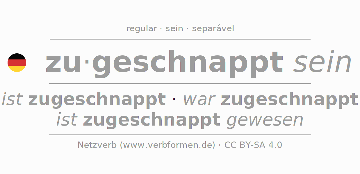 A conjugação do verbo zuschnappen (bater, fechar) é regular. As formas mais comuns são ist zugeschnappt, war zugeschnappt e ist zugeschnappt gewesen. O verbo auxilar para zuschnappen é "sein". No entanto, há formas verbais com o verbo auxiliar " haben".